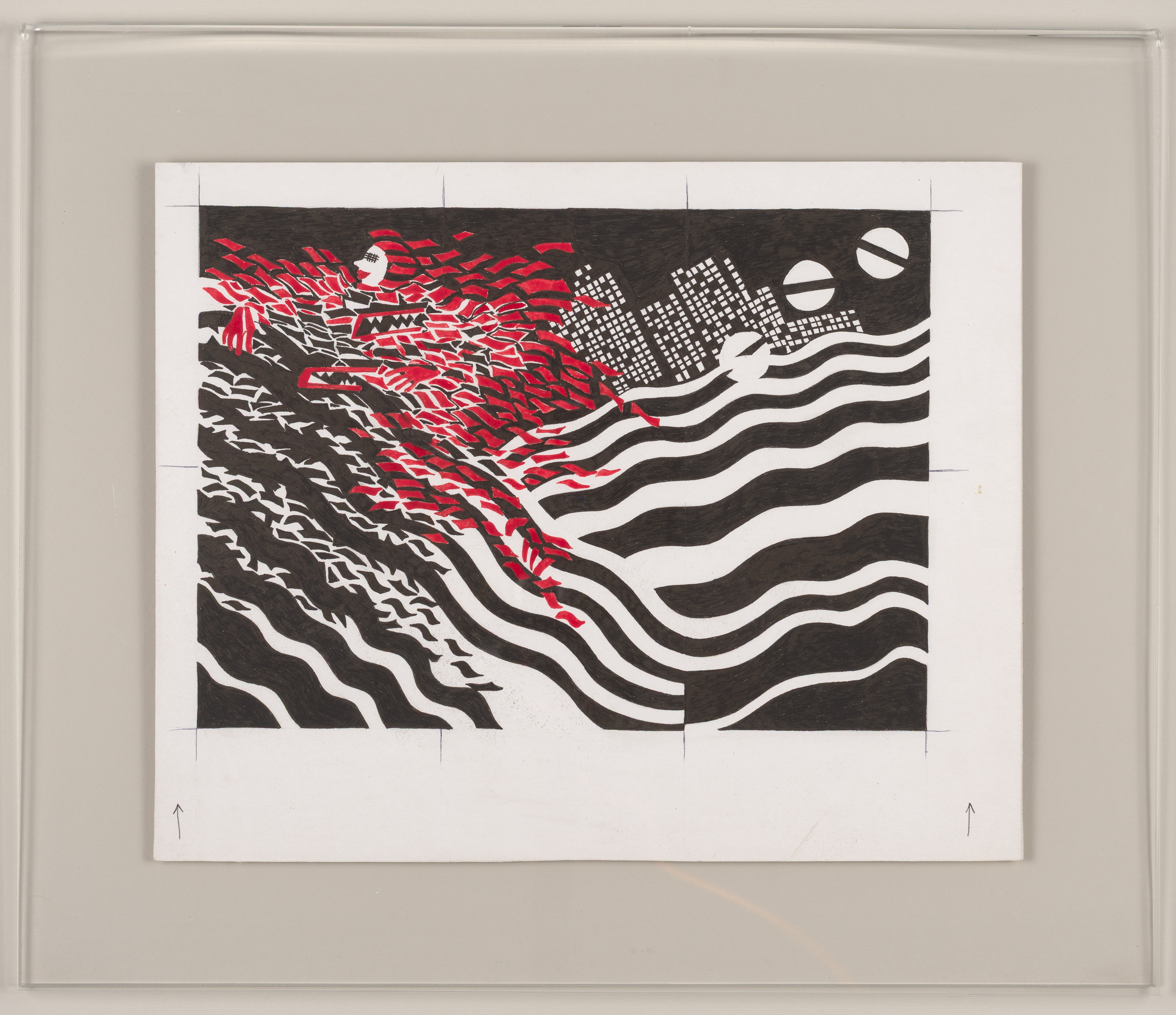 Obra de formato rectangular y orientación horizontal. Composición en base a pequeños fragmentos rojos en la esquina superior izquierda. Entre ellos hay dos manos rojas y un rostro de perfil que tiene los labios gruesos y rojos. Además. choca contra otros fragmentos, sin embargo, estos son negros y en ellos se ubican dos cabezas de animales que tienen la boca roja y muestren sus dientes. El fondo es negro con líneas ondulas blancas, cuadrados pequeños y tres círculos con una línea diagonal negra.