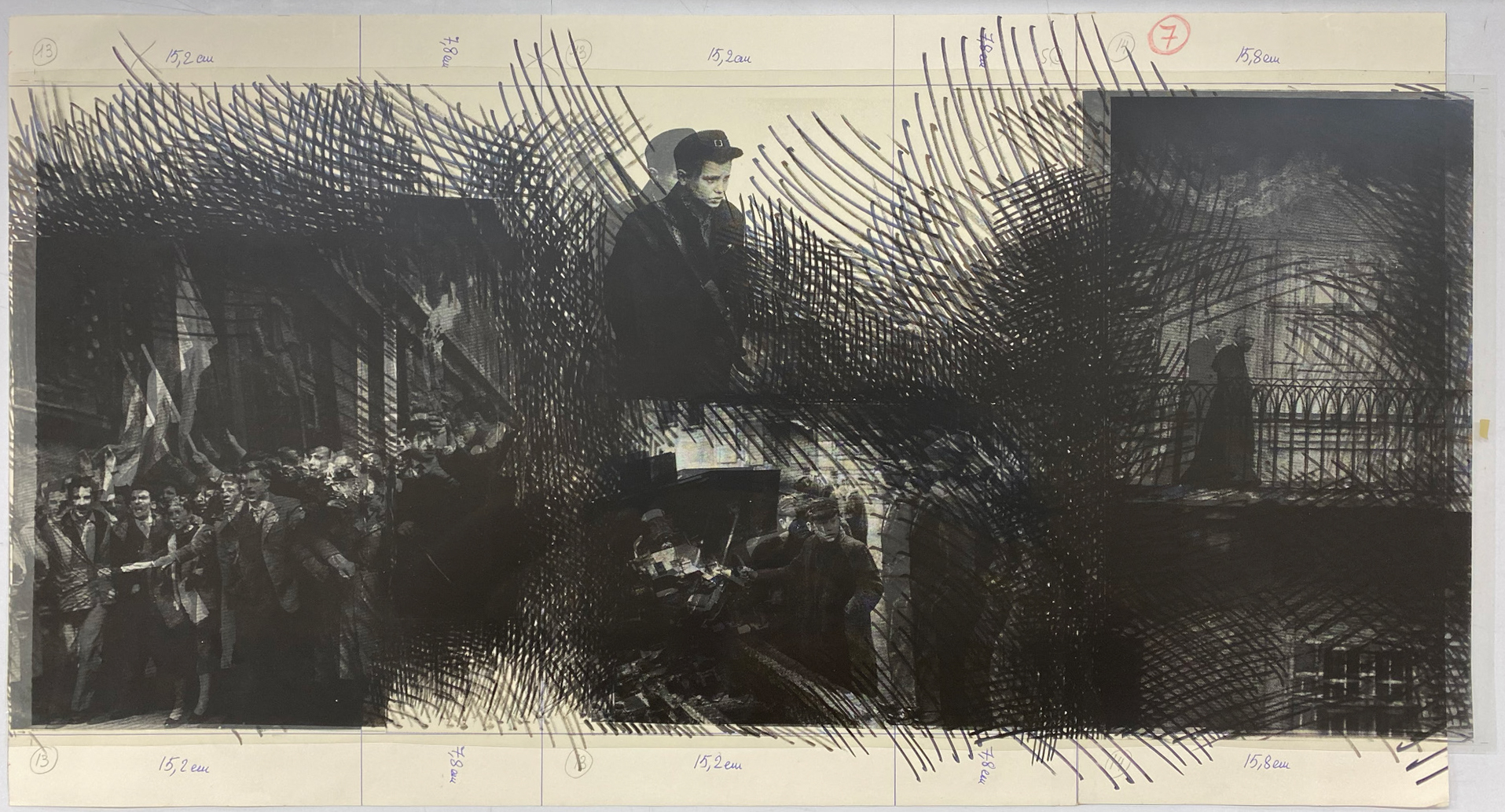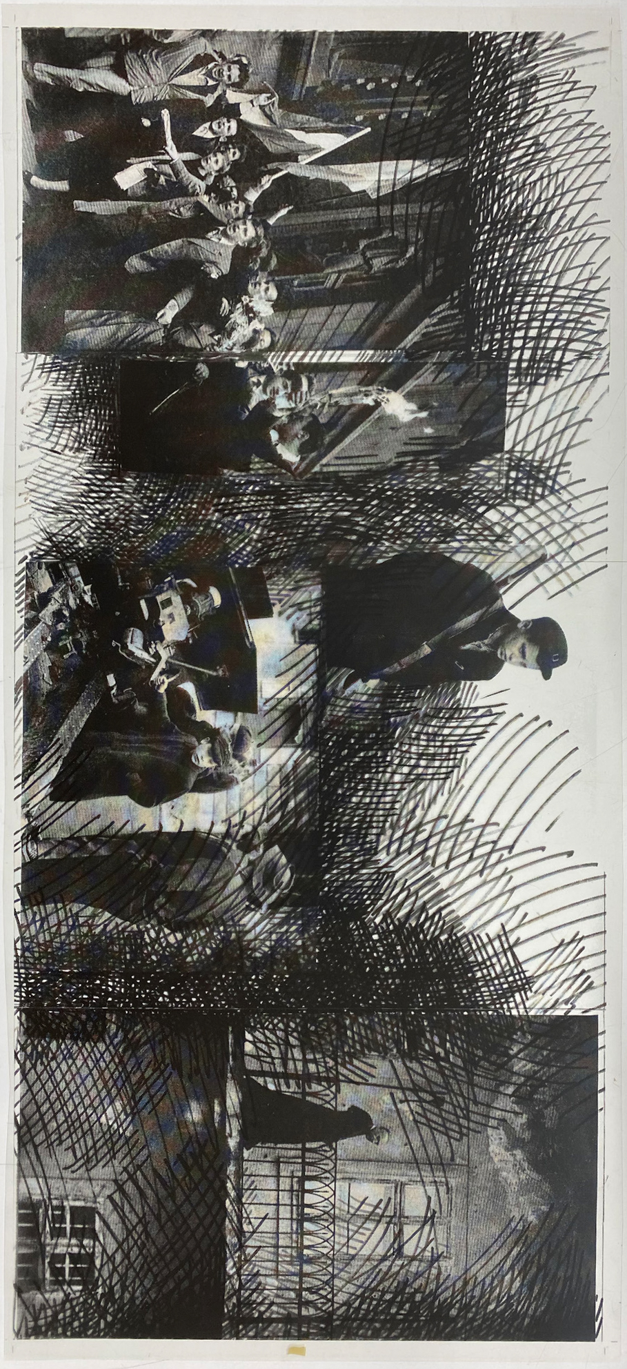 Obra de formato rectangular y orientación horizontal. Políptico en base a nueve paneles y conjunto compuesto por veintisiete bocetos realizados a mano sobre papel con sus respectivas fotocopias e impresiones sobre mica. Tanto los bocetos, las fotocopias y las micas presentan fotografías en blanco y negro de escenas urbanas y retratos individuales cubiertos por líneas negras achuradas. El fondo de los bocetos es un plano con anotaciones de medidas, números que van del uno al nueve, secciones rectangulares en varios tamaños y trazos realizados con lápiz negro entrecruzados en diversas direcciones. Algunas fotografías presentan rasgaduras y otras están recortadas de manera uniforme. En algunos retratos se ven a las figuras humanas de espaldas. También hay escenas exteriores rurales con grupos de figuras humanas a pie o sobre carros.