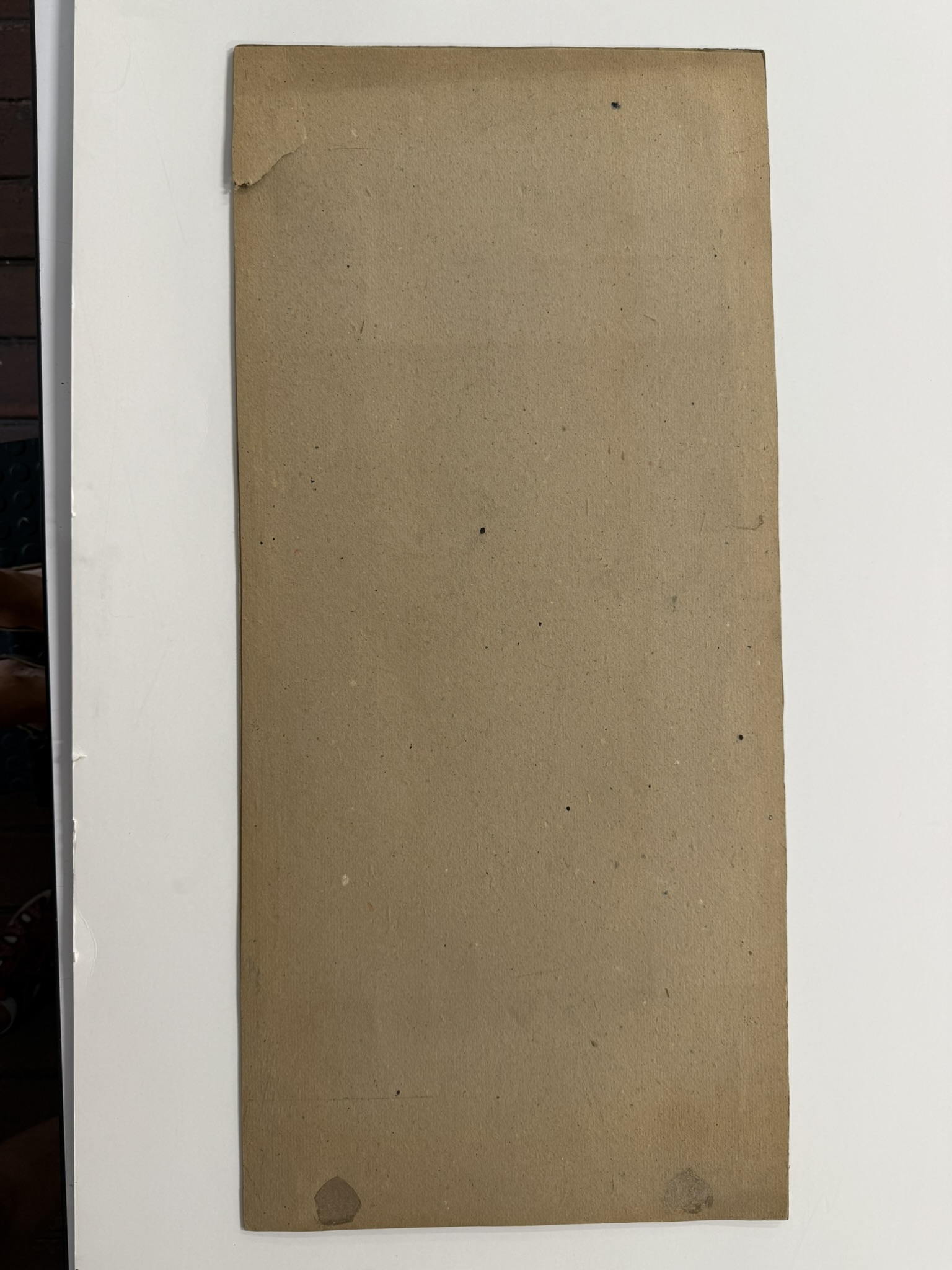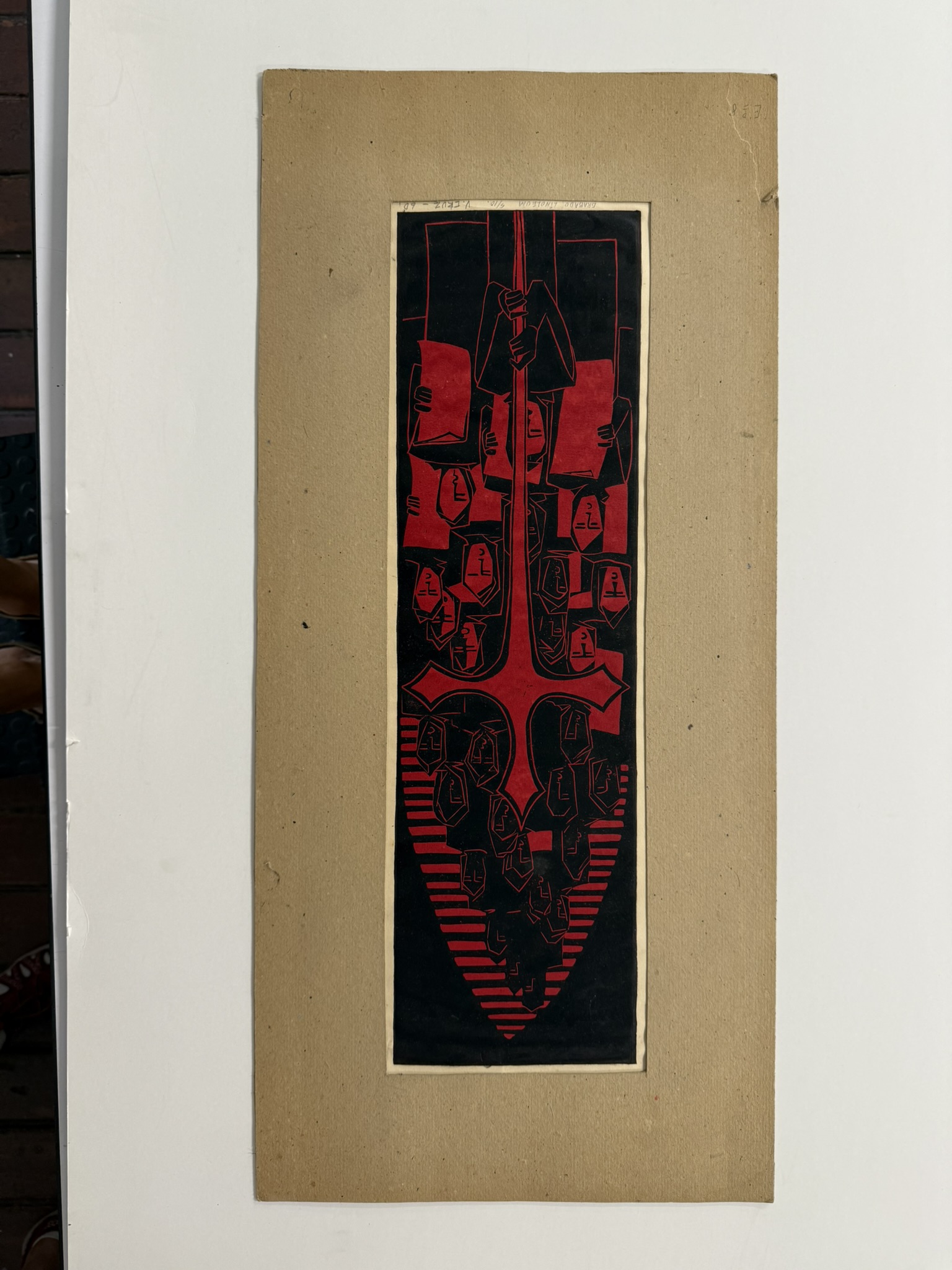 Obra de formato rectangular y orientación vertical. Composición en base a una procesión liderada por una persona que sostiene en sus manos una cruz de gran altura y tamaño. Las figuras en su mayoría visten un velo y togas negras y en sus manos llevan una hoja que miran atentamente. La obra es de color negro y rojo.