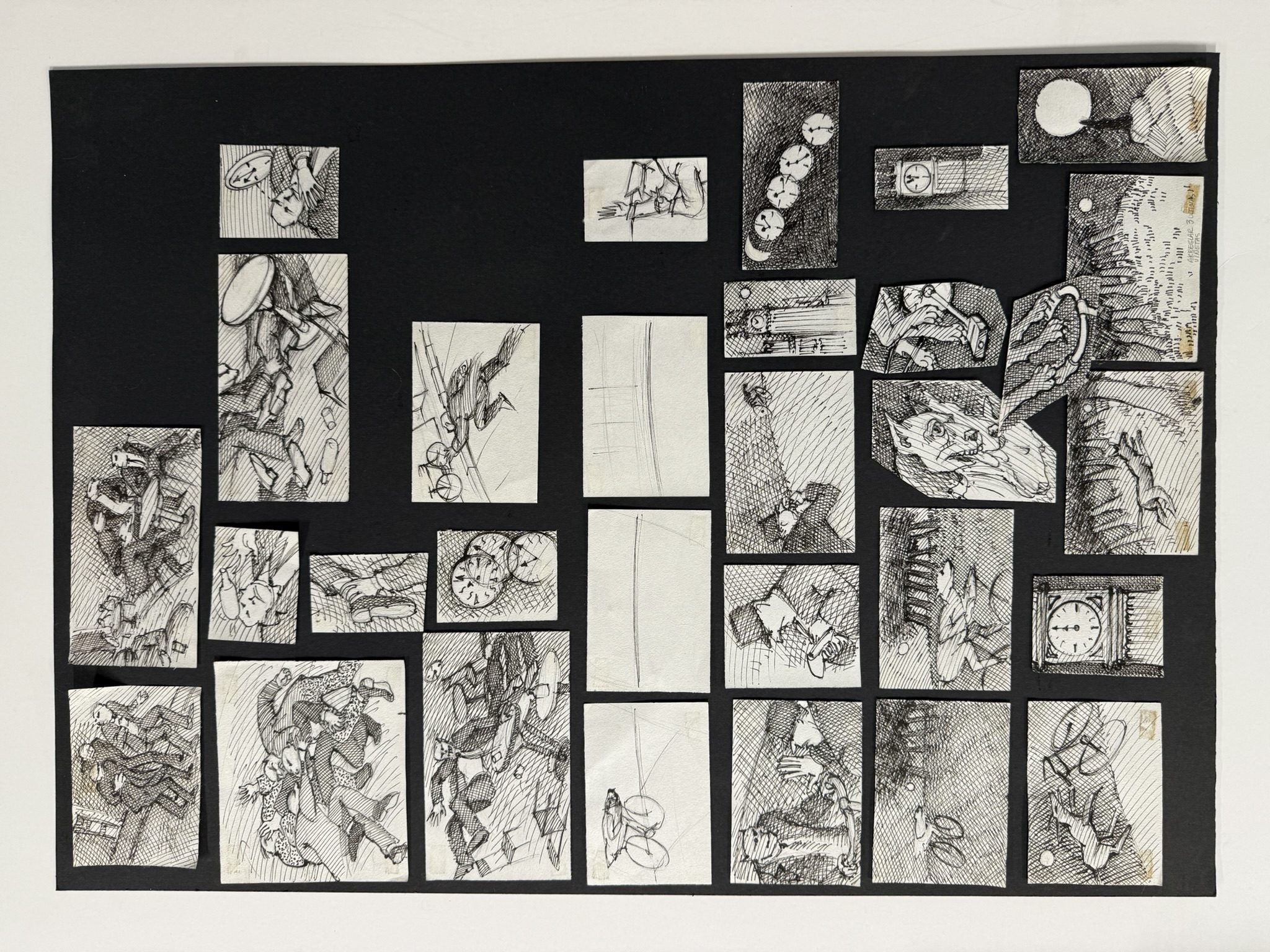 Obra de formato rectangular y orientación vertical. Composición en base a fondo negro con cuadrados y rectángulos blancos que representan distintas escenas de una misma historia. En ellos se muestra a una figura zoomorfa que se encuentra en una pelea, que se escapa en bicicleta y que termina llegando a un bosque en una noche de luna llena.