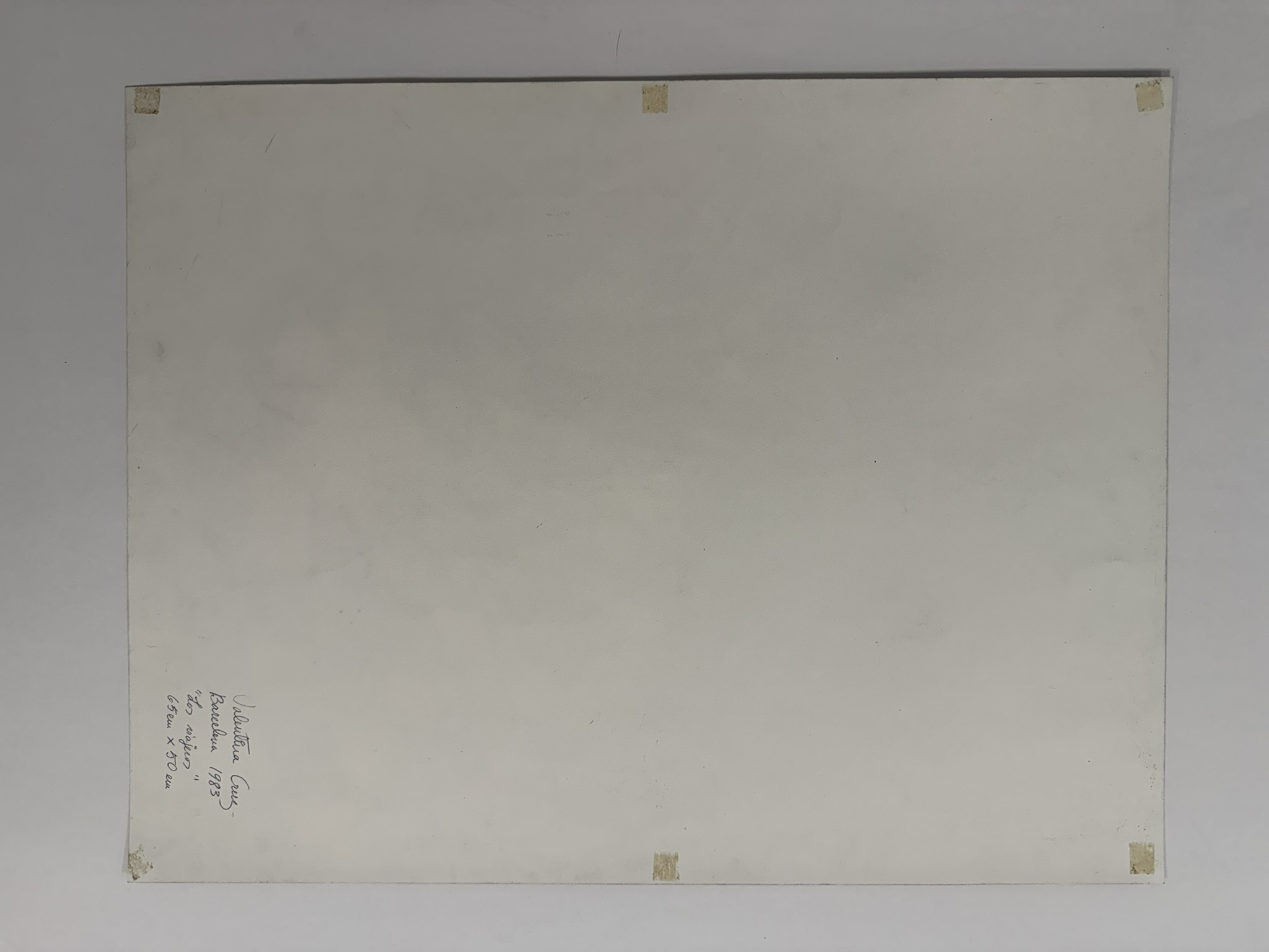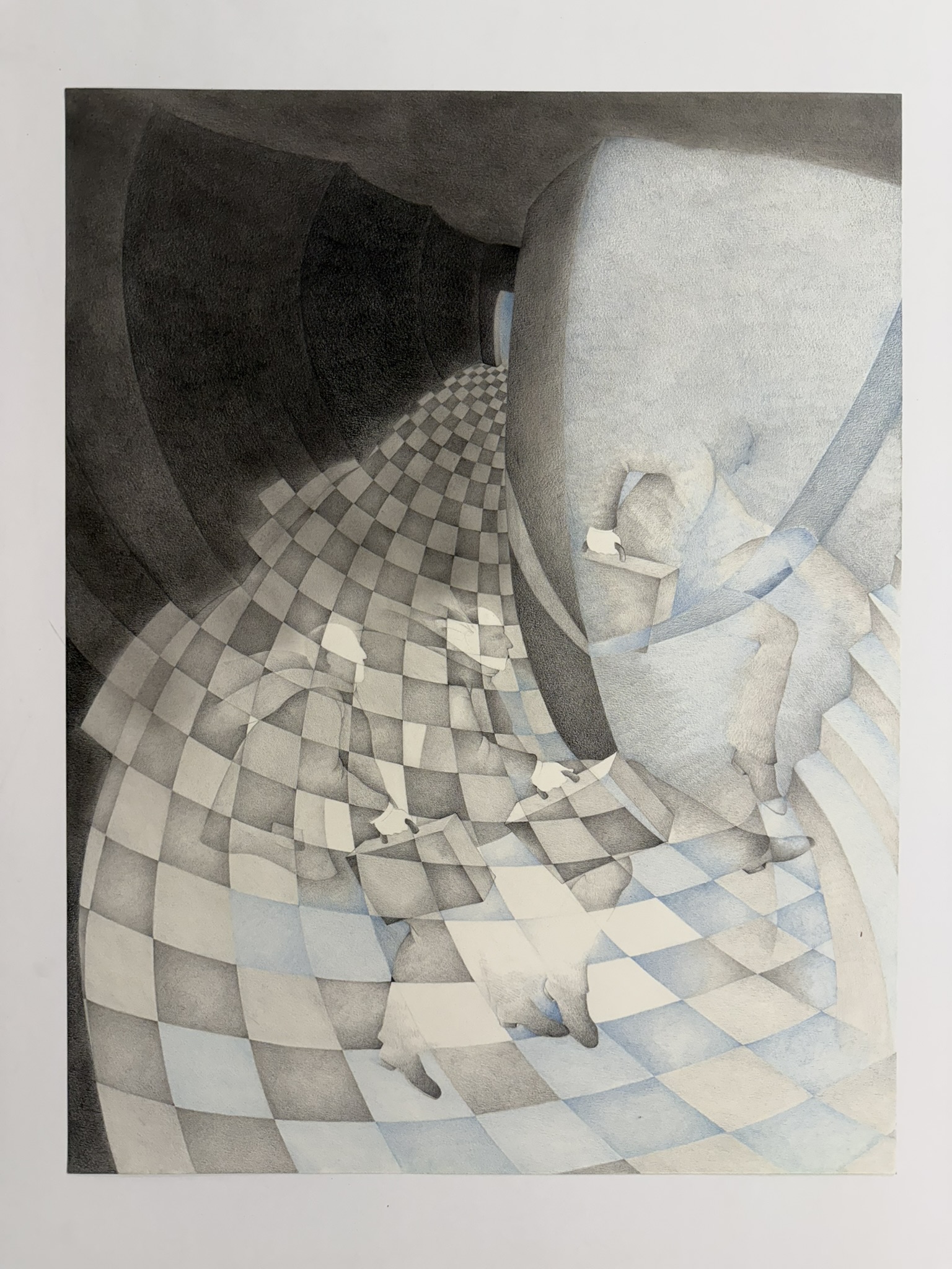 Obra de formato rectangular y orientación vertical. Composición en tonos grises y azules en base a las siluetas de tres figuras humanas en primer plano que se dirigen a una escalera. Las tres se mimetizan casi por completo con su entorno, aunque se distinguen los perfiles de sus rostros y los maletines que cada una de ellas lleva en su mano derecha. Las figuras se encuentran en un pasillo alargado cuyo piso sigue el patrón de un tablero de ajedrez. En segundo plano, al fondo del pasillo, se ubica una puerta iluminada por una luz azul.