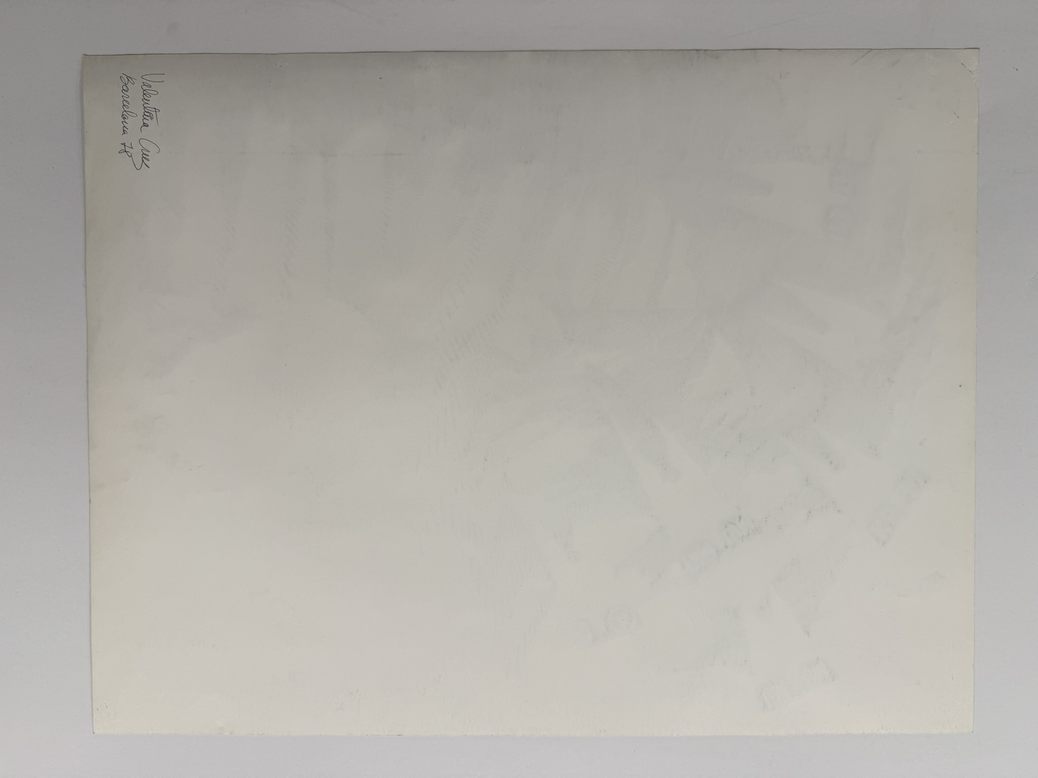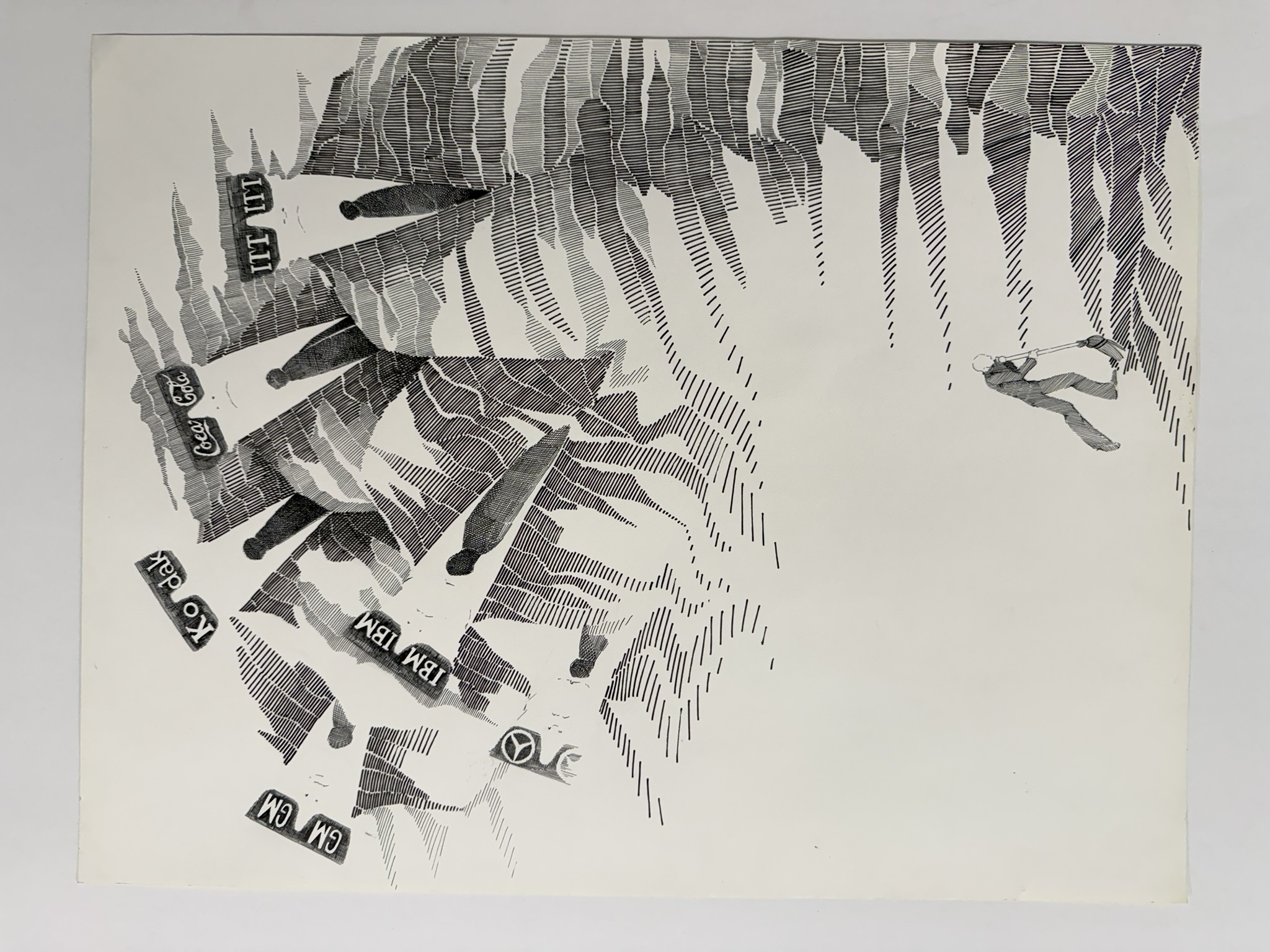 Obra de formato rectangular y orientación vertical. Composición en tonos blancos y grises en base a seis figuras humanas ubicadas en la zona superior de la obra. Todas visten trajes negros y corbatas. Además, llevan gafas oscuras con distintas inscripciones blancas en la parte de los lentes. Los trajes están conformados por líneas rectas que a su vez se transforman en formas ondulantes que bajan por el costado derecho y que son barridas por una figura humana de menor tamaño en la zona inferior de la obra.