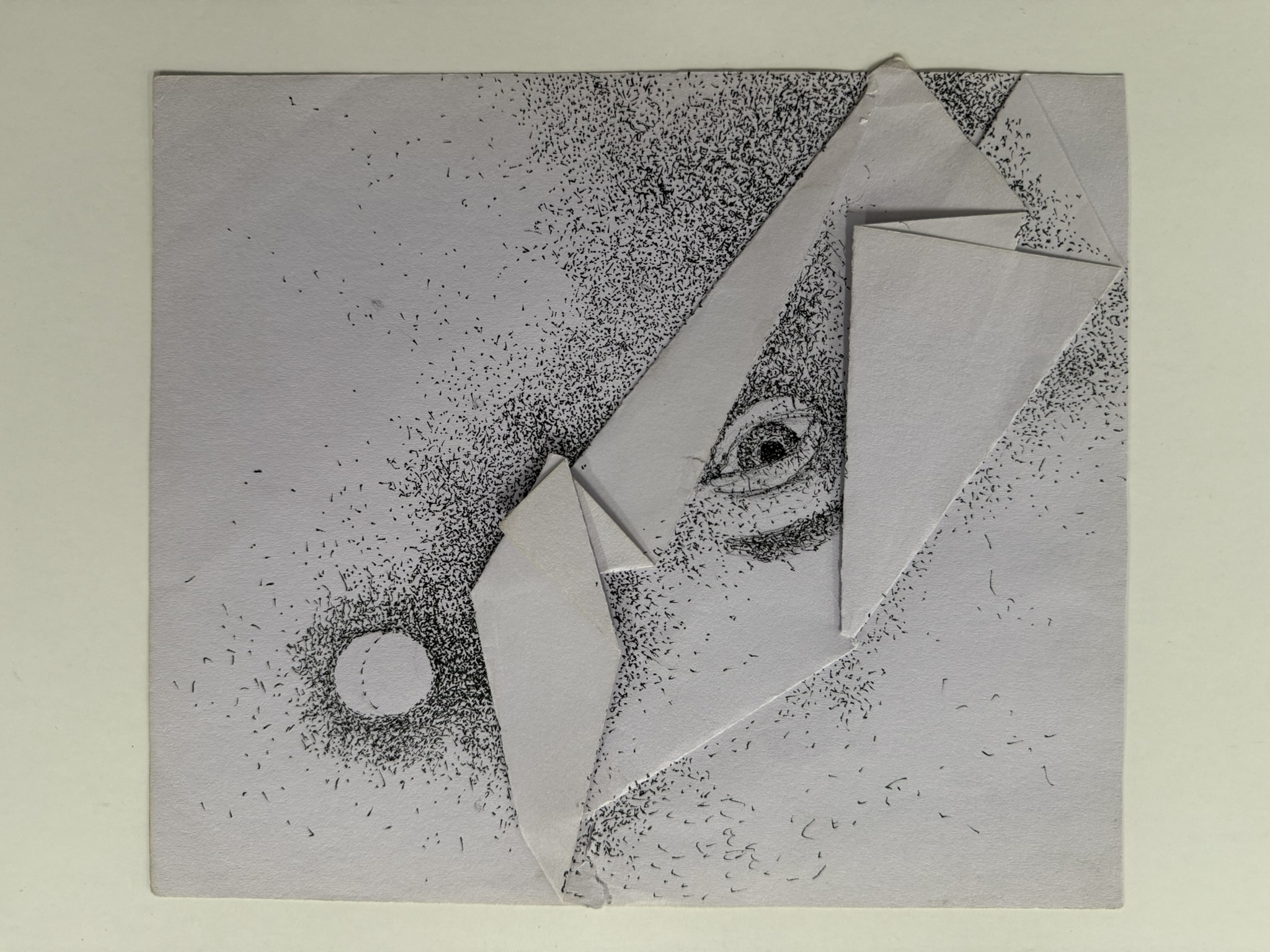 Obra de formato rectangular y orientación horizontal. Composición en base a figuras geométricas plegadas sobrepuestas sobre fondo blanco. Entre medio de las figuras, y como figura central, hay un ojo rodeado por muchos puntos negros. En la sección derecha, hay un círculo que también está rodeado de puntos negros.