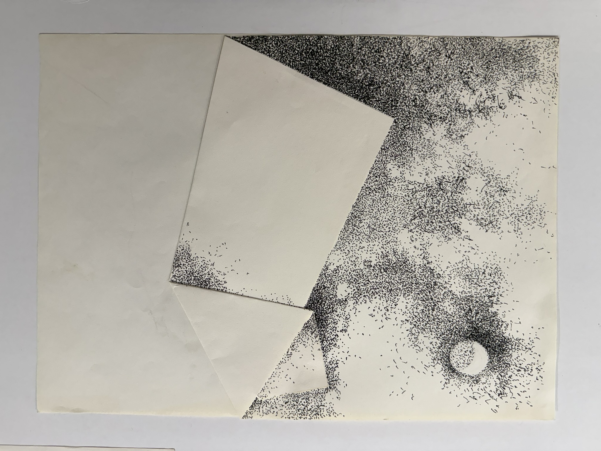 Obra de formato rectangular y orientación horizontal. Composición en base a figuras geométricas plegadas sobrepuestas sobre fondo blanco. En la mitad izquierda de la obra se ubica una media luna rodeada por puntos negros que cubren gran parte de la sección.