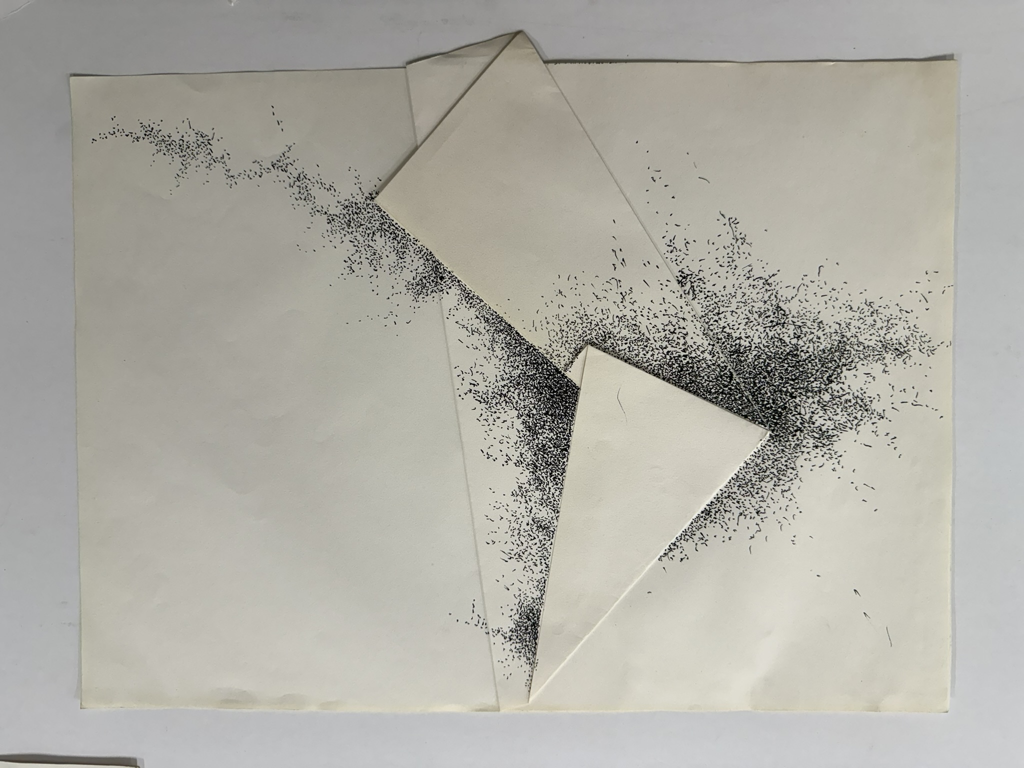 Obra de formato rectangular y orientación horizontal. Composición en base figuras geométricas plegadas sobrepuestas sobre fondo blanco. Por debajo del triángulo que se ubica en el centro salen pequeños puntos negros que se agrupan mayoritariamente en la sección izquierda. Otros en menor cantidad se dirigen a la zona derecha de la obra.