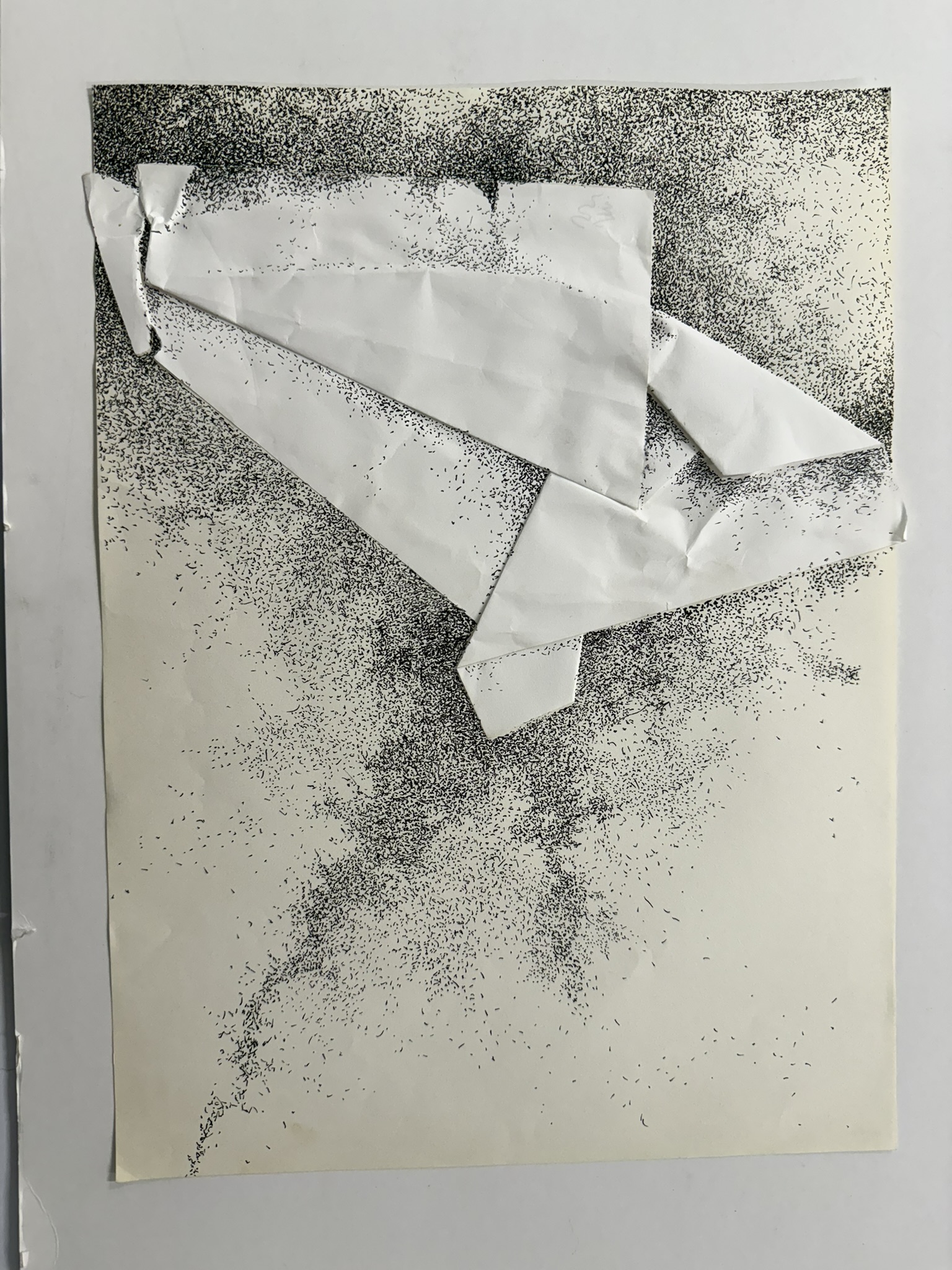 Obra de formato rectangular y orientación horizontal. Composición en base a figuras geométricas plegadas sobrepuestas sobre fondo blanco. Las figuras ubicadas en la zona izquierda de la obra se encuentran rodeadas por pequeños puntos negros que se van expandiendo por la superficie.