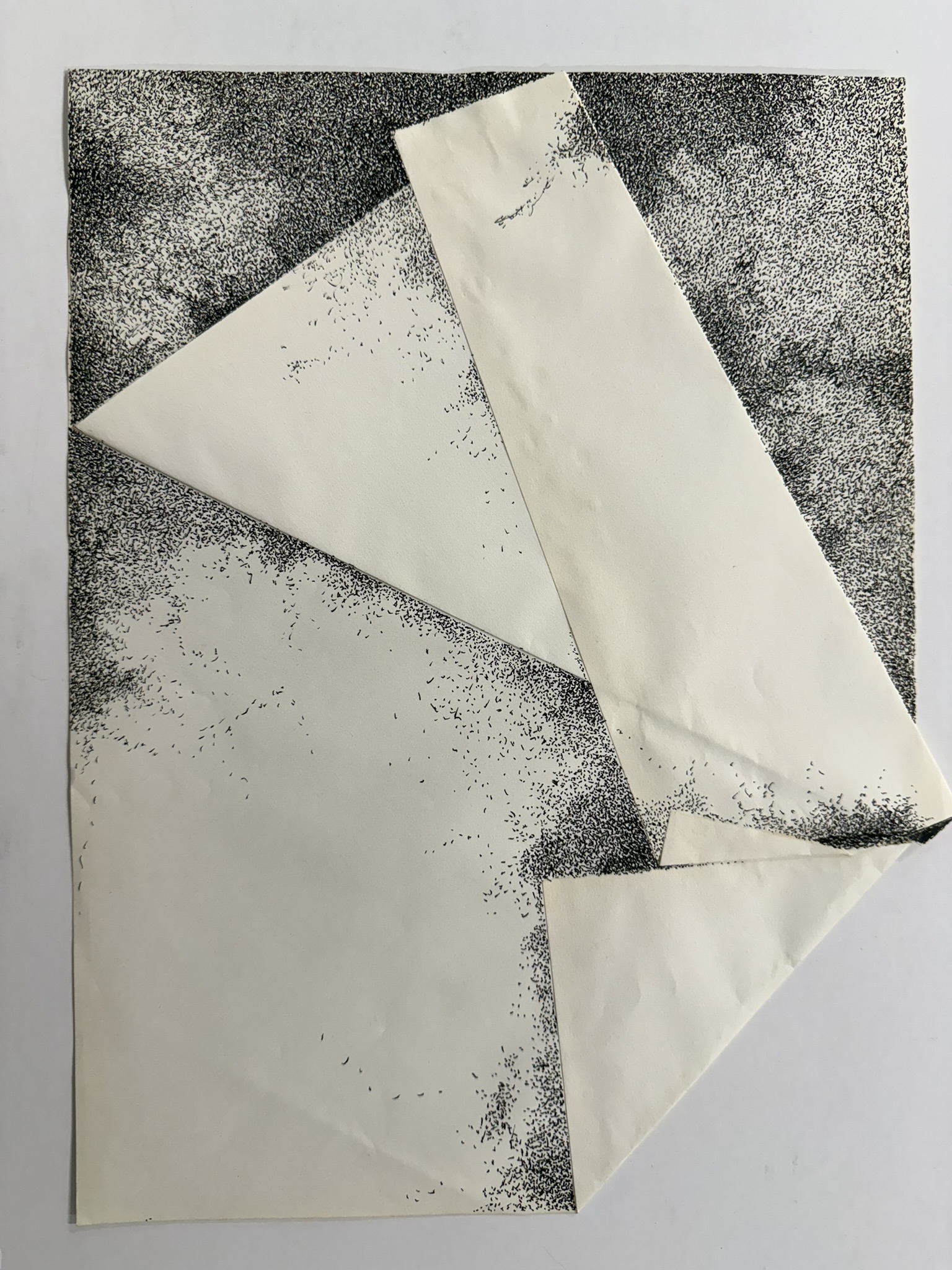 Obra de formato rectangular y orientación horizontal. Composición en base a figuras geométricas plegadas sobrepuestas sobre fondo blanco. En varias zonas de la obra, especialmente en los bordes y la zona izquierda, se encuentran varios puntos negros.