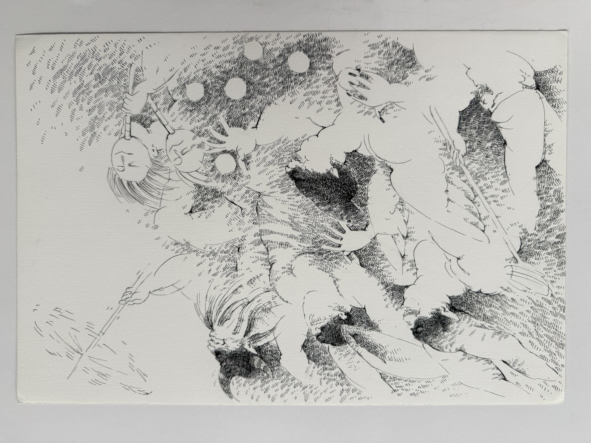 Obra de formato rectangular y orientación horizontal. Composición en base a figuras humanas abstractas con objetos de carnaval sobre fondo blanco. Desde la esquina superior izquierda hacia la esquina inferior derecha hay seis figuras desplazándose. Se observan cuatro rostros y la parte superior de estos está oscurecida, distinguiéndose solo desde la nariz hacía abajo. Tienen las bocas abiertas y dientes puntiagudos. Un rostro se encuentra camuflado por un par de máscaras que toma con una de sus manos. Una de las figuras lleva unos cuernos de toro. El grupo está realizado con líneas entrecruzadas en mayor o menor medida para generar variaciones grises.