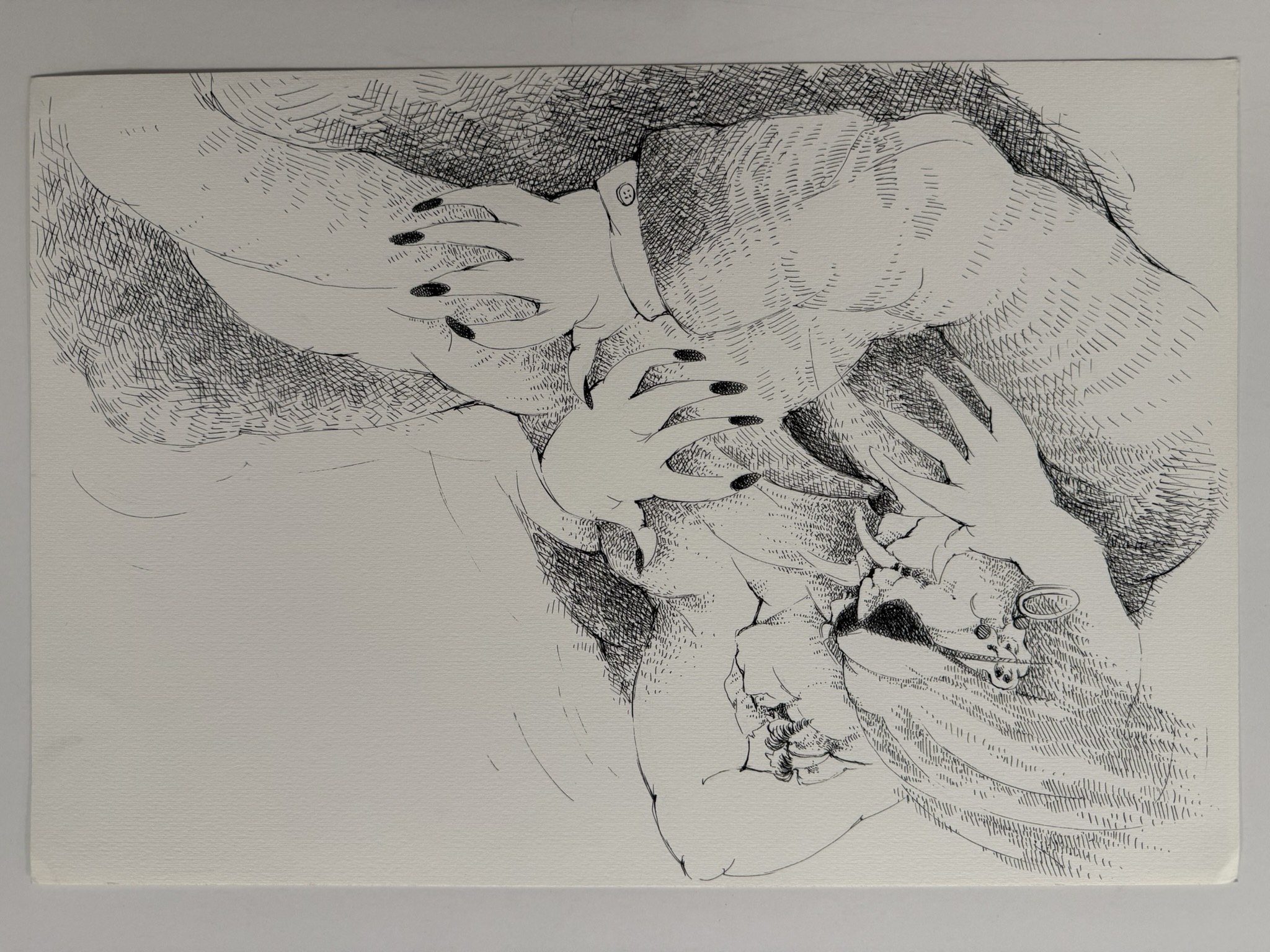 Obra de formato rectangular y orientación horizontal. Composición en base a pareja de figuras humanas sedentes. Una de las figuras lleva gafas oscuras, aretes, chaqueta y largas uñas pintadas de negro. Abraza a la otra figura, que está desnuda. No se distingue el rostro de esta última, solo brazos, piernas y torso. El pelo de la figura vestida está realizado con líneas entrecruzadas en lápiz negro que se va desdibujando hacía la esquina superior izquierda. El fondo es blanco.