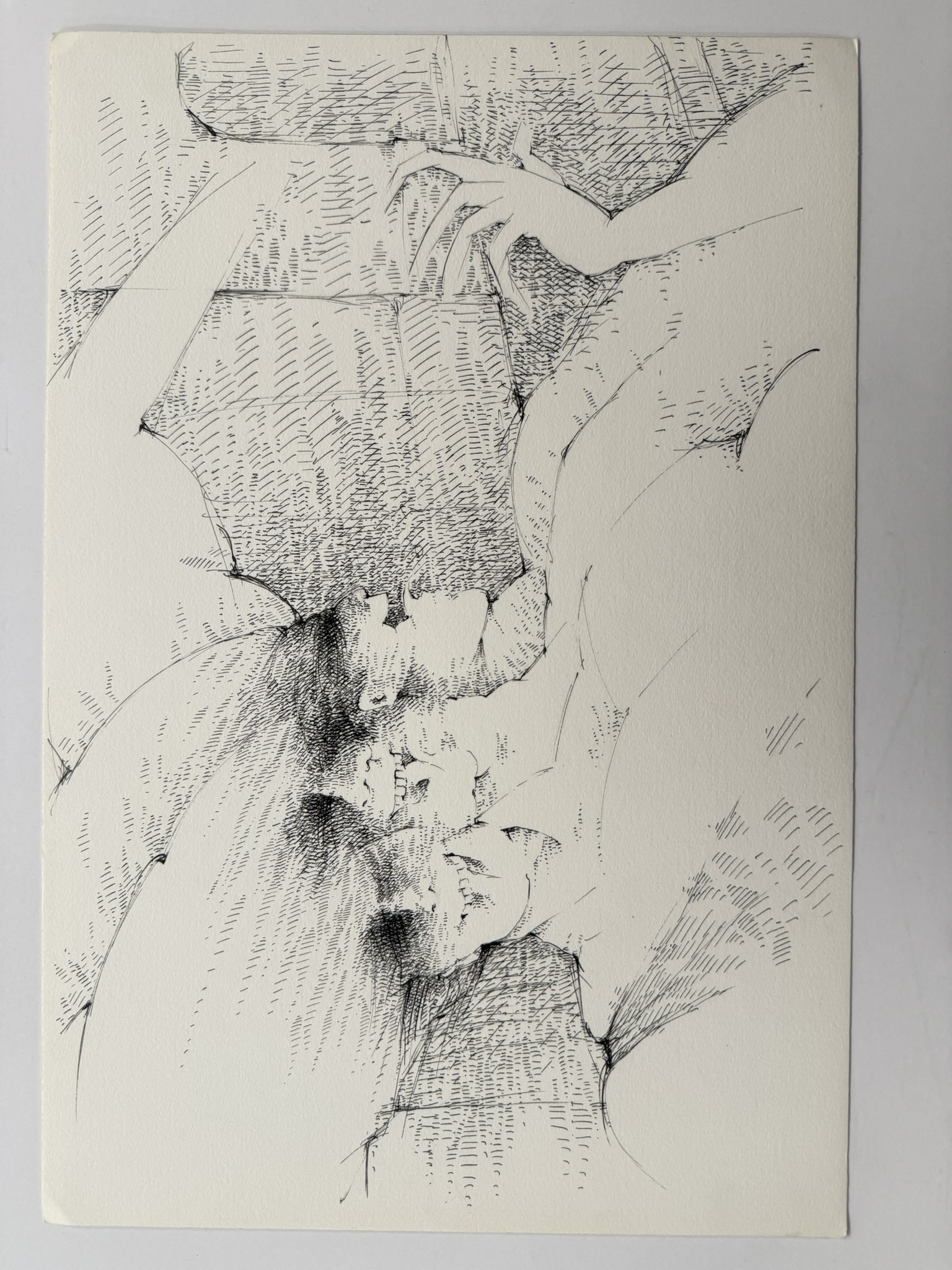 Obra de formato rectangular y orientación horizontal. Composición en base a dos figuras humanas sedentes de perfil con papeles en las manos. La parte superior de los rostros se encuentra desdibujada. Solo se distingue desde la nariz hacía abajo. Una de las figuras lleva un cartel con una inscripción ilegible colgado al cuello. Las manos tienen dedos largos y puntiagudos. Los papeles están unidos entre sí en largas filas. El fondo es blanco en la esquina superior izquierda y presenta líneas negras entrecruzadas en diversas direcciones en la derecha.