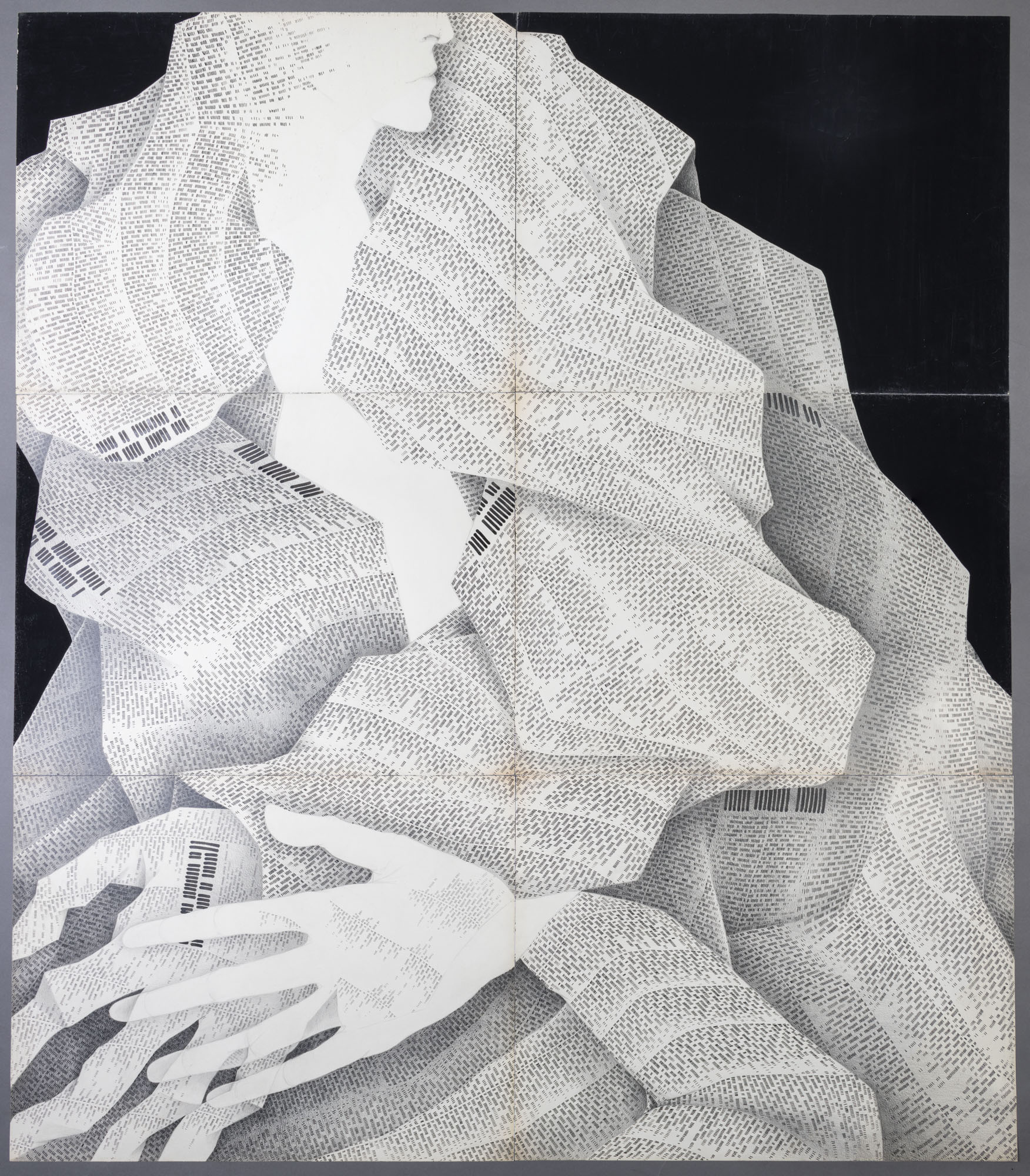 Obra de formato rectangular y orientación vertical. Composición en base a seis rectángulos unidos. En un primer plano hay un gran volumen blanco que simula la escritura de un periódico y que cruza desde la esquina superior izquierda hasta la inferior derecha. De este volumen sobresalen el perfil de un rostro humano y dos manos con dedos alargados.