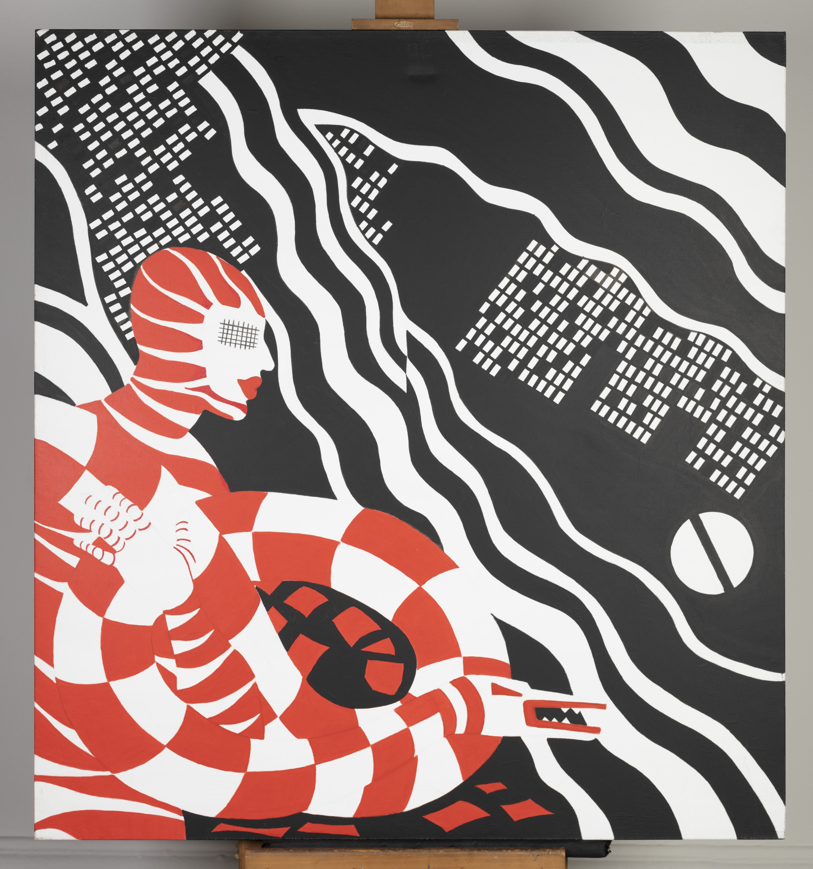 Obra de formato horizontal y orientación vertical. Composición en base a figura humana con el cuerpo de color rojo con franjas blancas. Su rostro es blanco con labios grandes de color rojo, y donde debería estar su ojos hay líneas verticales y horizontales negras. Ella se ubica de perfil en la esquina inferior izquierda, sosteniendo en sus manos una serpiente de gran tamaño de color rojo y blanco. El fondo es negro con líneas onduladas blancas, cuadrados pequeños y un círculo con una línea diagonal negra.