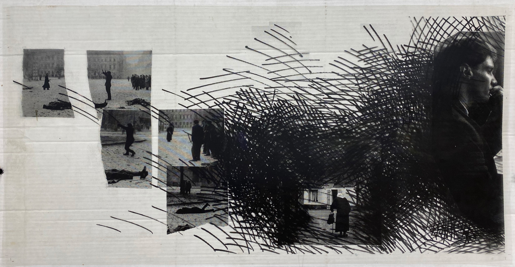Obra de formato rectangular y orientación horizontal. Conjunto en base a nueve bocetos realizados a mano sobre papel con sus respectivas fotocopias e impresiones sobre mica de una obra en formato de políptico. Tanto bocetos, fotocopias y micas se componen de fotografías en blanco y negro de escenas urbanas y retratos individuales cubiertos por líneas negras achuradas. El fondo de los bocetos es un plano con anotaciones de medidas, números que van del uno al nueve, secciones rectangulares en varios tamaños y trazos realizados con lápiz negro entrecruzados en diversas direcciones. Algunas fotografías presentan rasgaduras y otras están recortadas de manera uniforme. En algunos retratos se ven a las figuras humanas de espaldas. También hay escenas exteriores rurales en menor cantidad, con grupos de figuras humanas a pie o sobre carros.