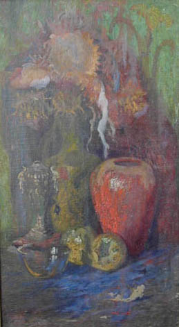 Aguamanil en primer plano, frutas y jarrón en rojo bermellón, más al fondo un florero con girasoles.