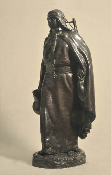 Obra exenta. Composición en base a figura femenina de cuerpo entero con vestido largo y manto sobre los hombros, porta además indumentaria propia de la población indígena, como el cinto en su frente y los accesorios que porta; cinturón, aretes y collar. La retratada, con un pie adelante, sostiene un cántaro en su mano derecha y porta un niño en su espalda.