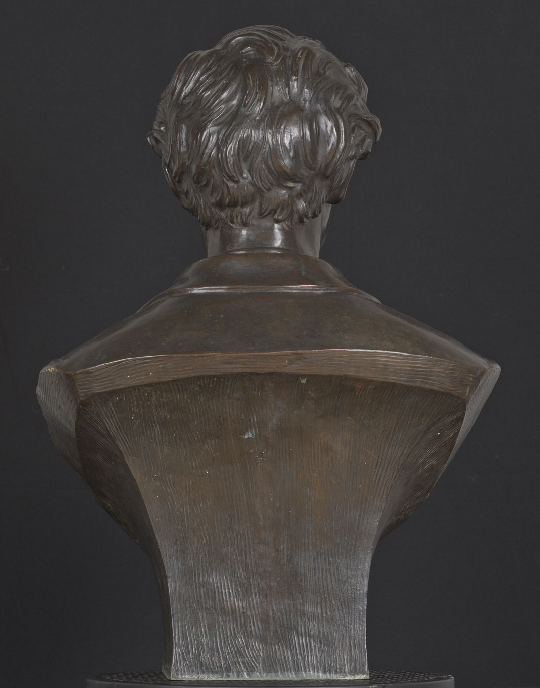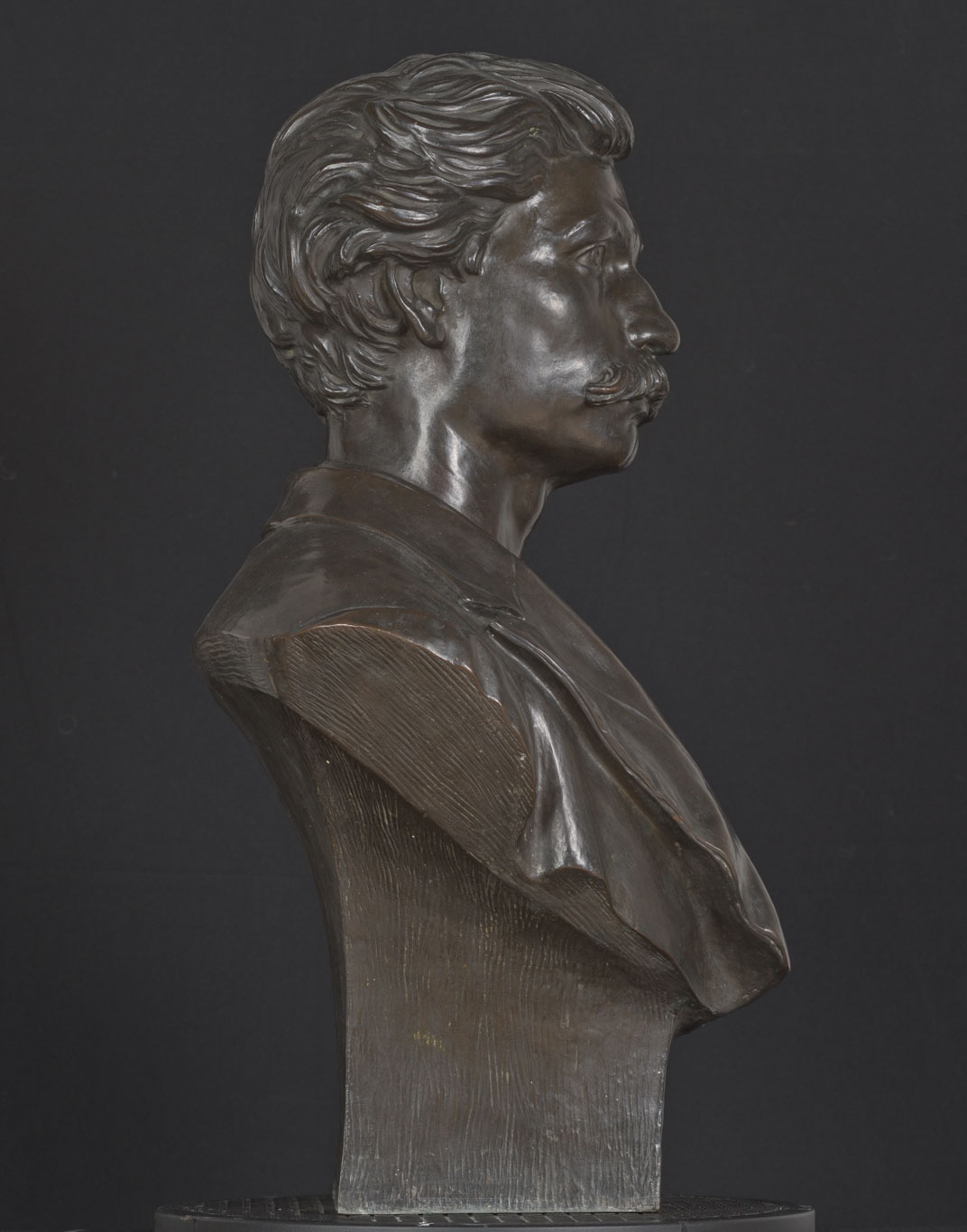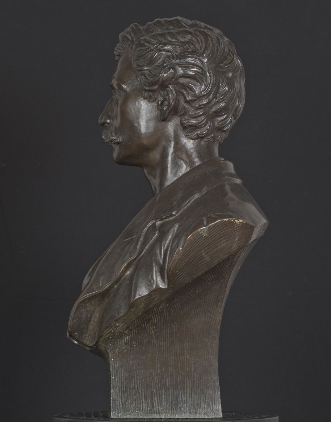 Obra exenta. Busto de figura masculina con pelo corto, ondulado, y bigotes. El retratado viste chaqueta de solapa ancha, gillette cruzado abotonado y camisa.