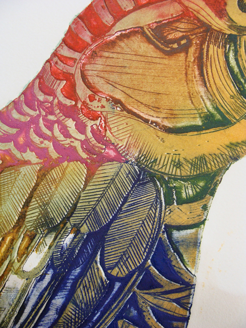 Obra rectangular, orientación vertical. Composición en base a perfil derecho de un guacamayo posado en una rama. Se distinguen tonos verde, ocre, rosa, naranjo y azul.