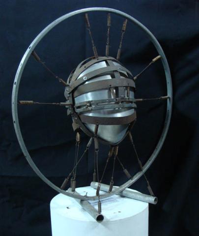 Obra exenta. Óvalo metálico inscrito a un aro. El óvalo esta rodeado de bandas metálicas y se sostiene mediante tiras con resortes fijados al aro.