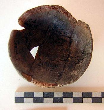 Contenedor abierto de perfil simple. Tiene labio redondeado, cuerpo hemisférico y base convexa. Cerámica modelada y alisada de color rojo oscuro y negro.