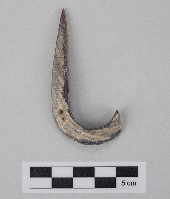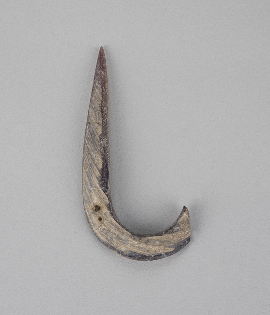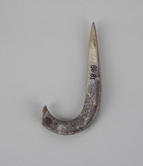 Objeto utilizado para pescar. Comienza en una punta para continuar en una recta hasta formar un semi circulo. Tallado en concha de choro zapato. De color marrón claro.
