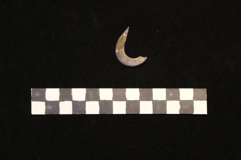 Instrumento de pesca, con forma curva, ambos extremos terminan en punta, confeccionado en concha de choro zapato, color ocre.