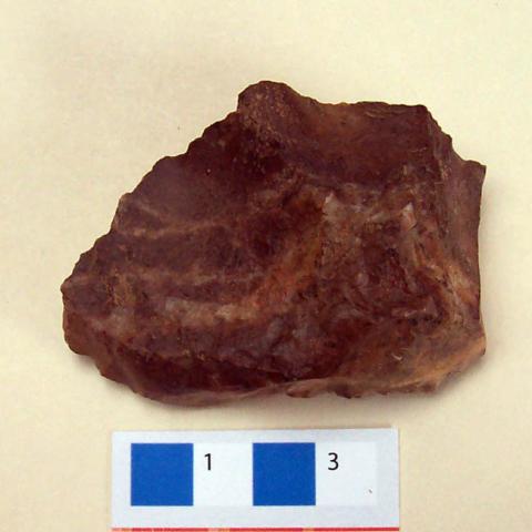 Instrumento lítico inacabado. Tiene forma triangular irregular con bordes aserrados y base plana. Está elaborado en piedra tallada bifacialmente de color marrón rojizo.
