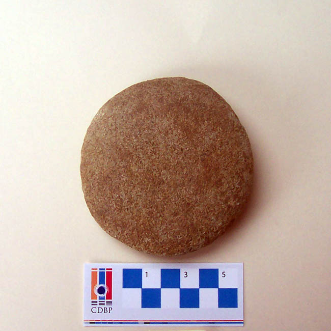 Instrumento lítico usado en la molienda. Tiene forma cilíndrica regular con ambas caras ligeramente curvas y bordes redondeados. Piedra tallada y pulida de color gris. Superficie rugosa.