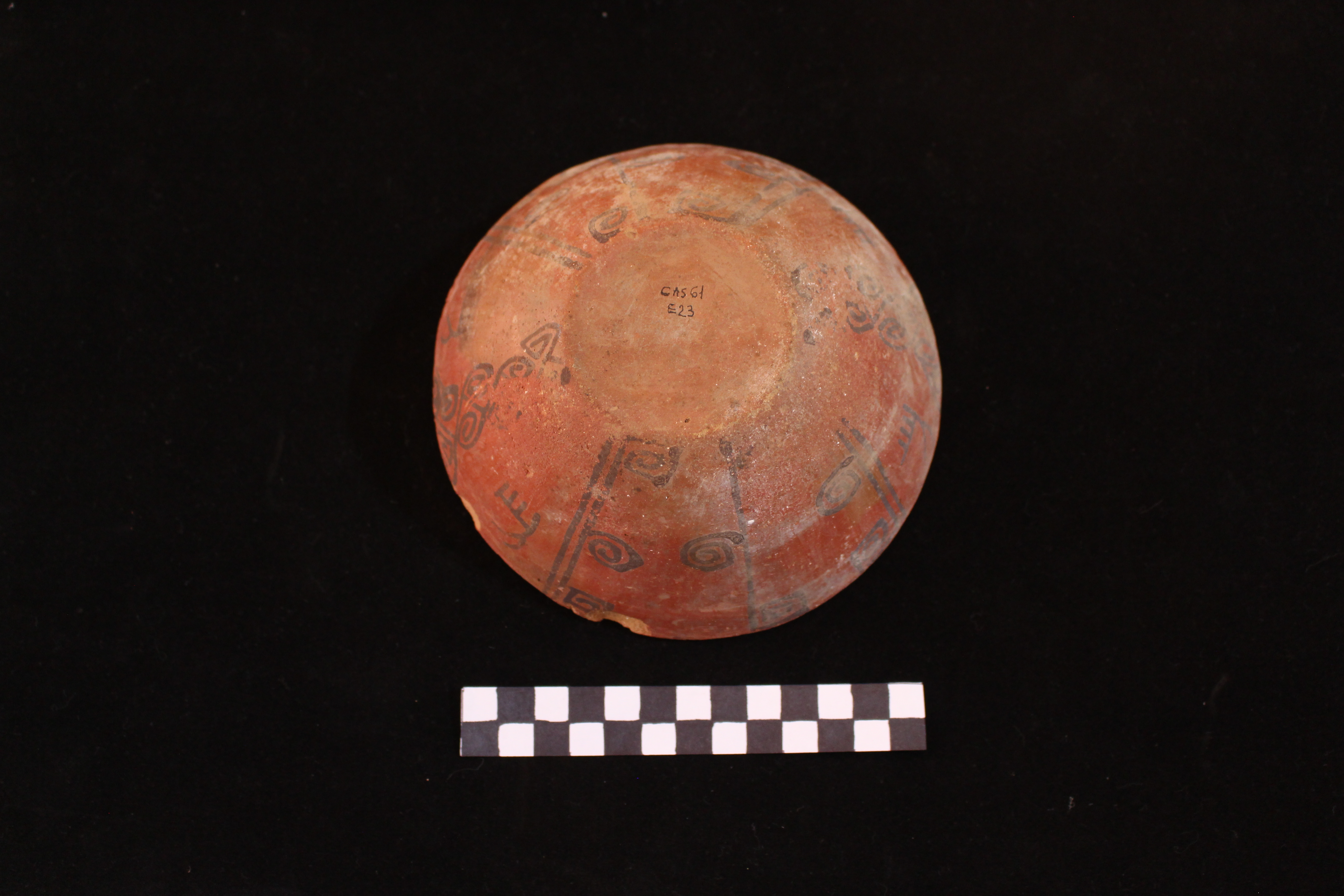 con decoración interior y exterior en pintura negra lineal y de patrones curvos.
