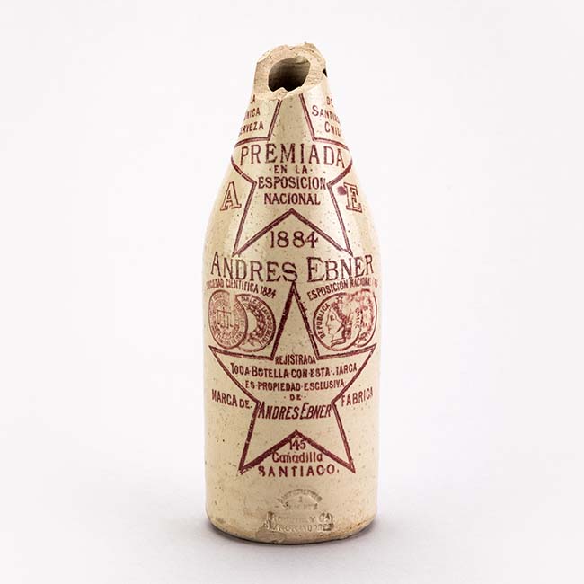 Recipiente de líquidos, utilizado para cerveza. Volumen cilíndrico, de cerámica. Al extremo superior se eleva el gollete cilíndrico; el cuerpo presenta un perfil recto y la base forma curva con un breve zócalo circular. Color crema, con inscripciones de color rojo.