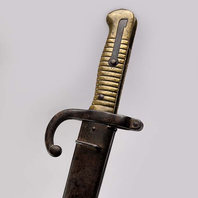 Sable de hoja de metal curva. Empuñadura ornamentada. Mango anatómico estriado. Vaina de metal color gris.