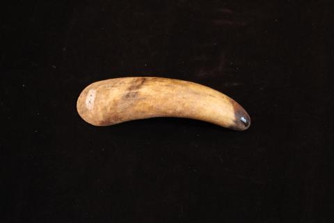 Recipiente con forma cónica, ahuecado, con un extremo más ancho que el otro. De color café y negro, realizada con la proyección ósea de la región frontal de un animal.