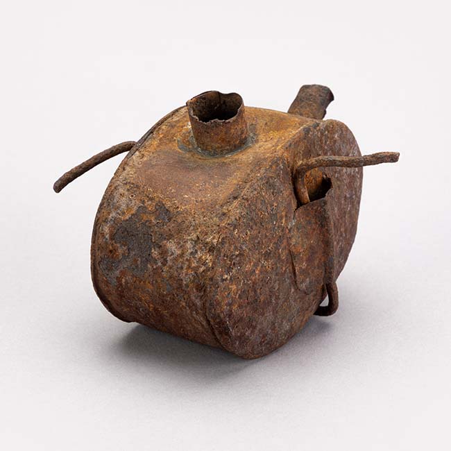 Artefacto pequeño de forma elipsoidal, que contiene en su interior aceite o grasa, que permite dar combustión a una mecha encendida. Lampara minera utilizada por los peones en las minas de Atacama, siglo XIX.