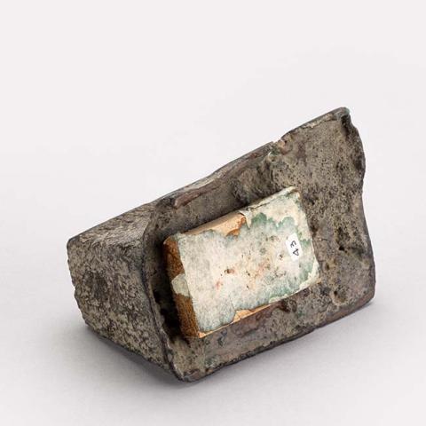 Barra de piedra con estructura gris de cuerpo firme y formato piramidal. En la sección inferior posee adherido un rectángulo metálico de cobre.