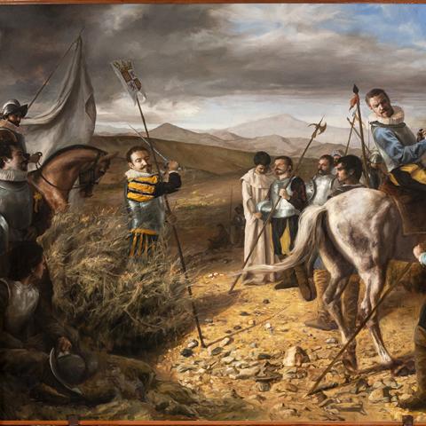 Obra de formato rectangular con orientación horizontal. Se observan 12 personajes de pie y 2 personajes a caballo en distinta posición. Al centro de la escena un hombre con espada y vestimenta de conquistador español. Paisaje desértico con cerros y nubes en el cielo.
