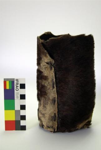 Recipiente de cuero, colectado por el sacerdote Martín Gusinde durante su estadía en Magallanes. Ingresado el año 1926 a la colección del Museo de Etnología y Antropología de Chile. El objeto fue posteriormente integrado a la colección del Museo Histórico Nacional con el N° 9668 MHN y en el año 1995 es traspasado a la colección del Museo Nacional de Historia Natural mediante Resolución Exenta Nº 137 del Consejo de Monumentos Nacionales, del 08 mayo de 1995. Desde esa fecha ha permanecido en el depósito de colecciones del Área de Antropología como parte de la Colección Gusinde. Este objeto está ingresado en la colección Etnográfica del Área de Antropología, lo que lo convierte en Monumento Nacional. (Ley N° 17.288, art. 1°).