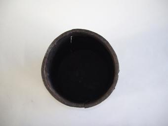 Objeto de forma cilíndrica y cóncava, de base plana. Tiene dos alambres que sujetan la estructura, uno cercano al borde superior y otro en el borde inferior.