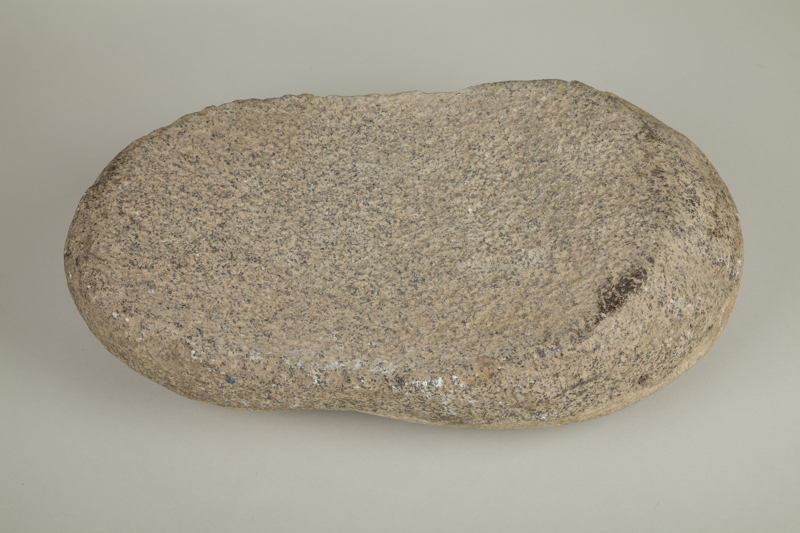 Forma ovalada y base irregular . De color gris. La superficie es semi cóncava. Presenta degaste por el uso.