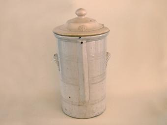 Objeto de forma cilíndrica de color blanco opaco, con tapa cubierta, la cual se encuentra quebrada en dos partes. Tiene un orificio por el cual se filtraba el agua, tiene dos asas de forma de oreja con insiciones laterales.