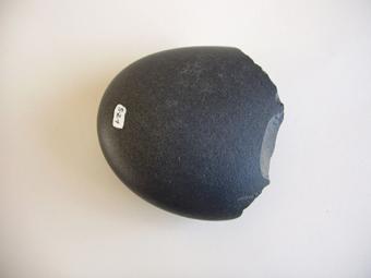 Instrumento lítico de forma ovalada, de sección semi plana con uno de sus bordes trabajados. Está elaborado en piedra tallada y pulida de color negro.
