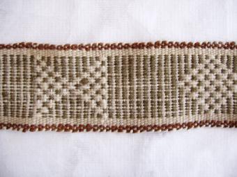 Pieza de forma rectangular realizada con lana de oveja hilada de un cabo o hebra torcido denominado huiñi, color blanco natural, verde teñido con pello pello y café teñido con maqui. La técnica textil utilizada para su confección mediante el telar quelgwo o de viga, es faz de urdimbre simple, urdido por pares, el que posteriormente se selecciona en dos capas de colores contrastantes, dando origen a la estructura textil denominada peinecillo. Esta estructura formada por 22 pares, está en el centro de la faja, compuesto por dibujos geométricos de dos triángulos opuestos unidos en su vértice, tipo sopaipilla bajo la secuencia de escogido dos a dos. Esta integración de dibujo en la estructura se denomina a nivel local como tejido de matra. Presenta terminación por excedente de urdimbre, flecos en ambos extremos. Por el largo de la faja, casi da tres vueltas en la cintura, se sugiere un uso de abrigo como también una función de sostener el pantalón del hombre.
