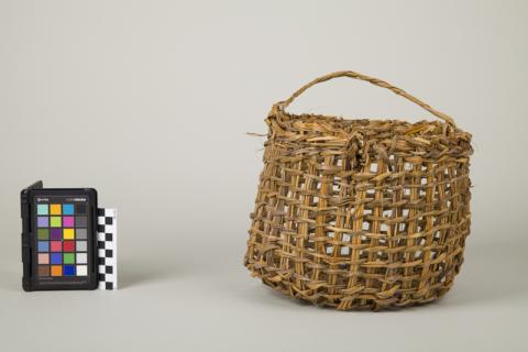 Contenedor de uso doméstico de forma cilíndrica y base plana, y un asa cinta o de perfil plano, en arco, en la parte superior. Objeto tejido con fibra vegetal.