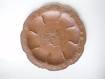 Bandeja de forma circular, con borde ondulado. Tiene repujado en sobrerelieve en la franja cercana al borde con figuras de copihues. Al centro tiene la figura del escudo Nacional de Chile.