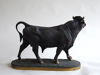Trofeo de figura zoomorfa ( toro). Éste se encuentra de pie, la cabeza gira levemente hacia el costado derecho y la cola la tiene levantada formando una semi circunferencia. Se encuentra sobre una base ovalada.