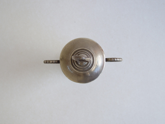 Objeto conmemorativo de borde redondeado, cuerpo inflectado y base cónica en pedestal. Tiene un asa verticales en voluta y tapa con un asa ovalada en la parte superior. Metal fundido de color gris brillante.