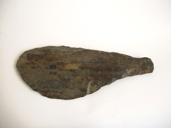 Forma ovalada de material al parecer granito color ceniza en uno de sus extremos tiene un estrechamiento.