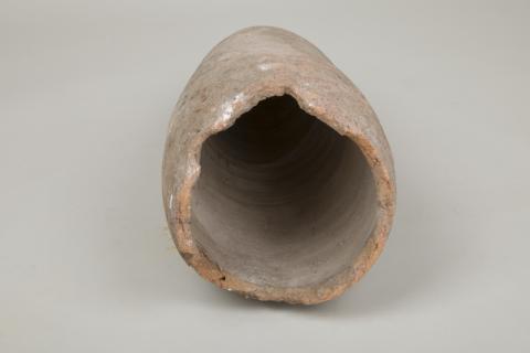 Contenedor restringido de perfil compuesto. Tiene lcuello troncocónico invertido, cuerpo ovalado y base apuntada. Cerámica modelada y alisada de color anaranjado. Objeto incompleto, le falta el extremo superior.