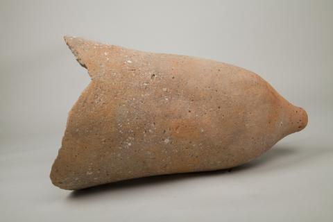 Contenedor restringido de perfil compuesto. Tiene lcuello troncocónico invertido, cuerpo ovalado y base apuntada. Cerámica modelada y alisada de color anaranjado. Objeto incompleto, le falta el extremo superior.