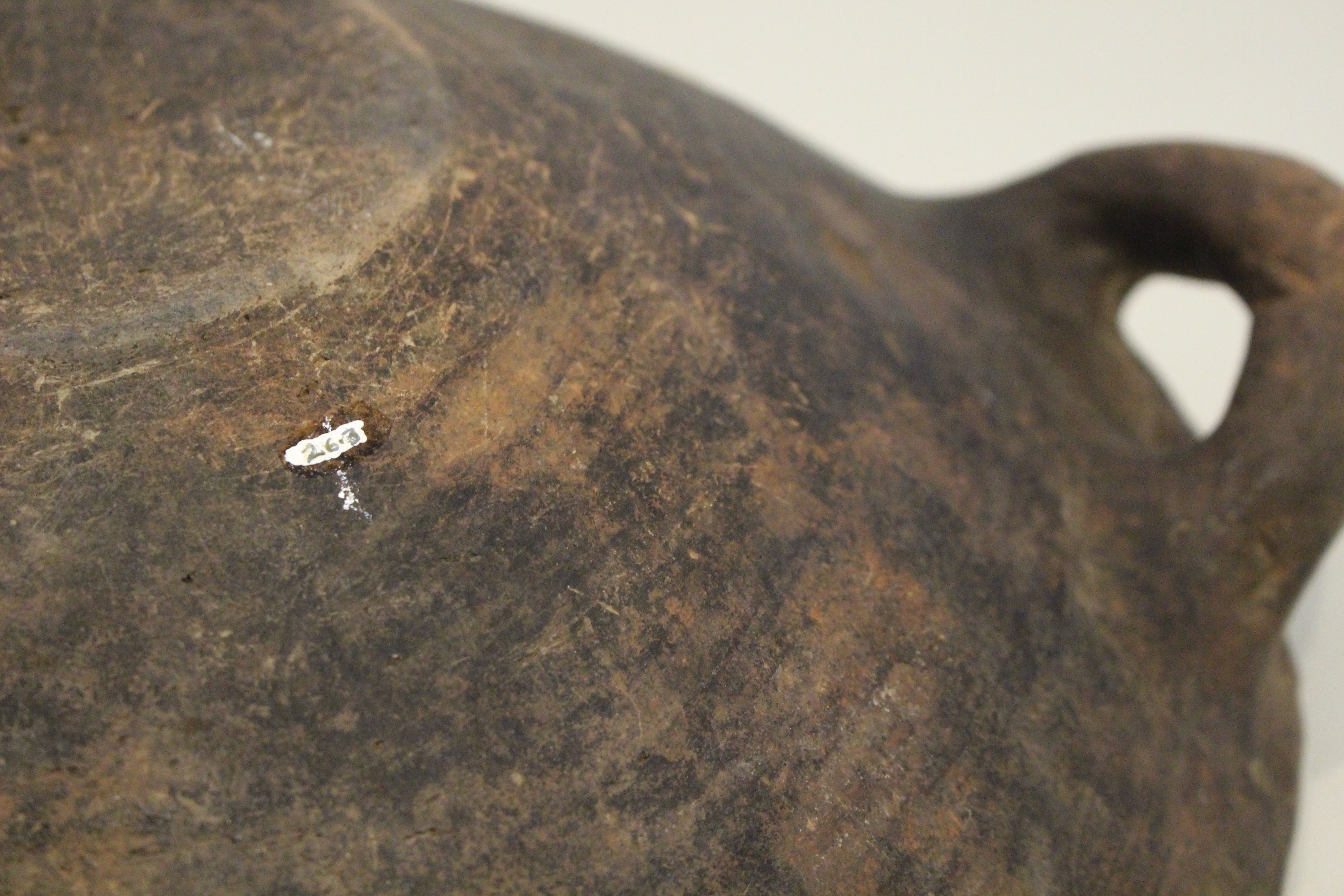 Contenedor abierto de perfil simple. Tiene labio redondeado, cuerpo cónico y base plana. Posee dos asas de orientación horizontal en la parte alta del cuerpo. Cerámica modelada y alisada de color marrón grisáceo.