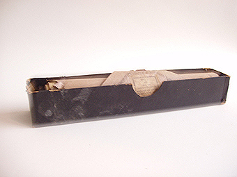 Rollo de papel con perforaciones de puntos y líneas verticales, enrollados sobre un tubo metálico. Se encuentra contenido dentro de una caja de cartón rectangular de color marrón oscuro.
