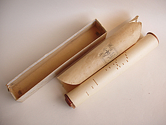 Objeto de forma cilíndrica compuesto por un rollo de papel con perforaciones de puntos y líneas verticales, enrollados sobre un tubo metálico. Se encuentra contenido en una caja rectangular sin tapadera.